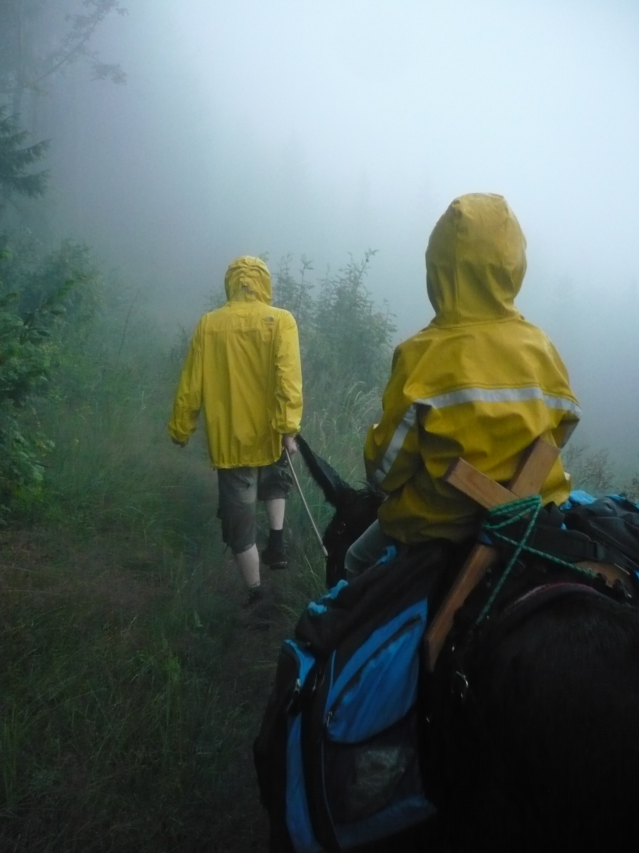 Geduld, Zuneigung, Ohrenblick, Sicherheitsabstand – klingt alles machbar. Bis zu besagtem Schotterweg, Kilometer Null von rund 18, eine halbe Stunde nach dem Start. Totalblockade. Wie eingemauert steht Heidi am Ackerrain, kaut genüsslich am saftigen Bewuchs und zeigt gleich mal, wer fortan Herr im Haus ist: Nicht der sportliche Stadtbewohner dahinter. Auch nicht seine ebenfalls zupackende Frau. Und schon gar nicht ihr kleines Kind mit dem Stock zur Hand, das es mit mantrischem „Nein“ versehen sanft aufs Hinterteil der Dame in schwarzgrau patscht, knapp unterhalb der hölzernen Kiepe, die scheinbar spielend das Reisegepäck staut. Heidi rules. Und das wird sich die nächsten drei Tage nicht ändern, niemals.
